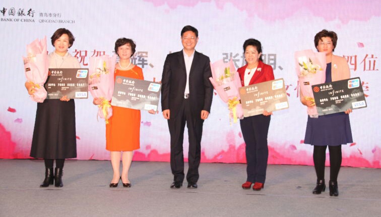 活动现场,中国银行青岛支行纪委书记兼工会工委主任付连晔向获得2016年度中国杰出创业女性称号的张旭明、董辉、杨丽、邢慧四位优秀的女企业家赠送中国银行无限卡表示祝贺。