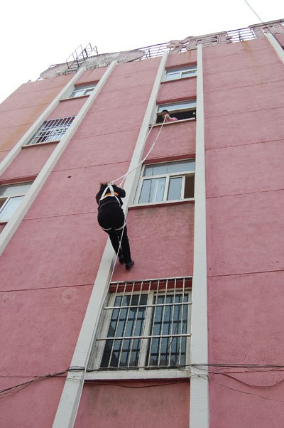 2010年11月19日下午,青岛亿和海丽高强力安全防护用品有限公司开展了高空火灾防护自救互救演习。57岁的梁子兰率先从高空使用救生缓降器安全下落到地面,并给大家现场讲解使用方法,活动吸引了大批市民参与并现场观摩。