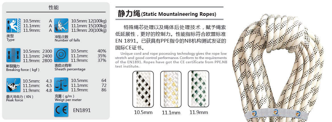 特殊绳芯处理以及绳体后处理技术,赋予静力绳低延展性,更好的控制力。性能指标符合欧盟标准EN 1891。已经获得具有PPE指令的NB机构测试发证的国际CE证书。静力绳已通过欧盟CE认证和国际登山协会UIAA认证。