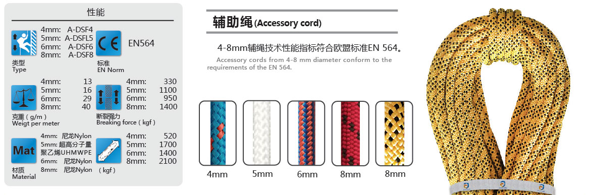 4-8mm辅助绳技术性能指标符合欧盟标准EN 564。