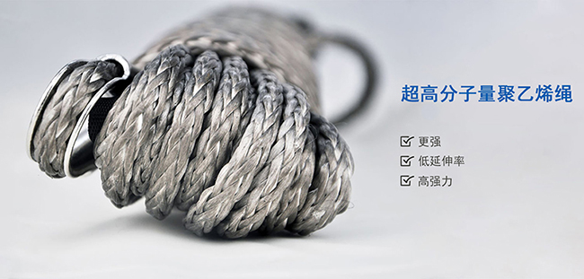 超高分子量聚乙烯纤维材料制作的越野绞盘绳,比同直径钢丝绞盘绳强度大,而且重量仅为钢丝绳的1/8,延伸率低,强度高。